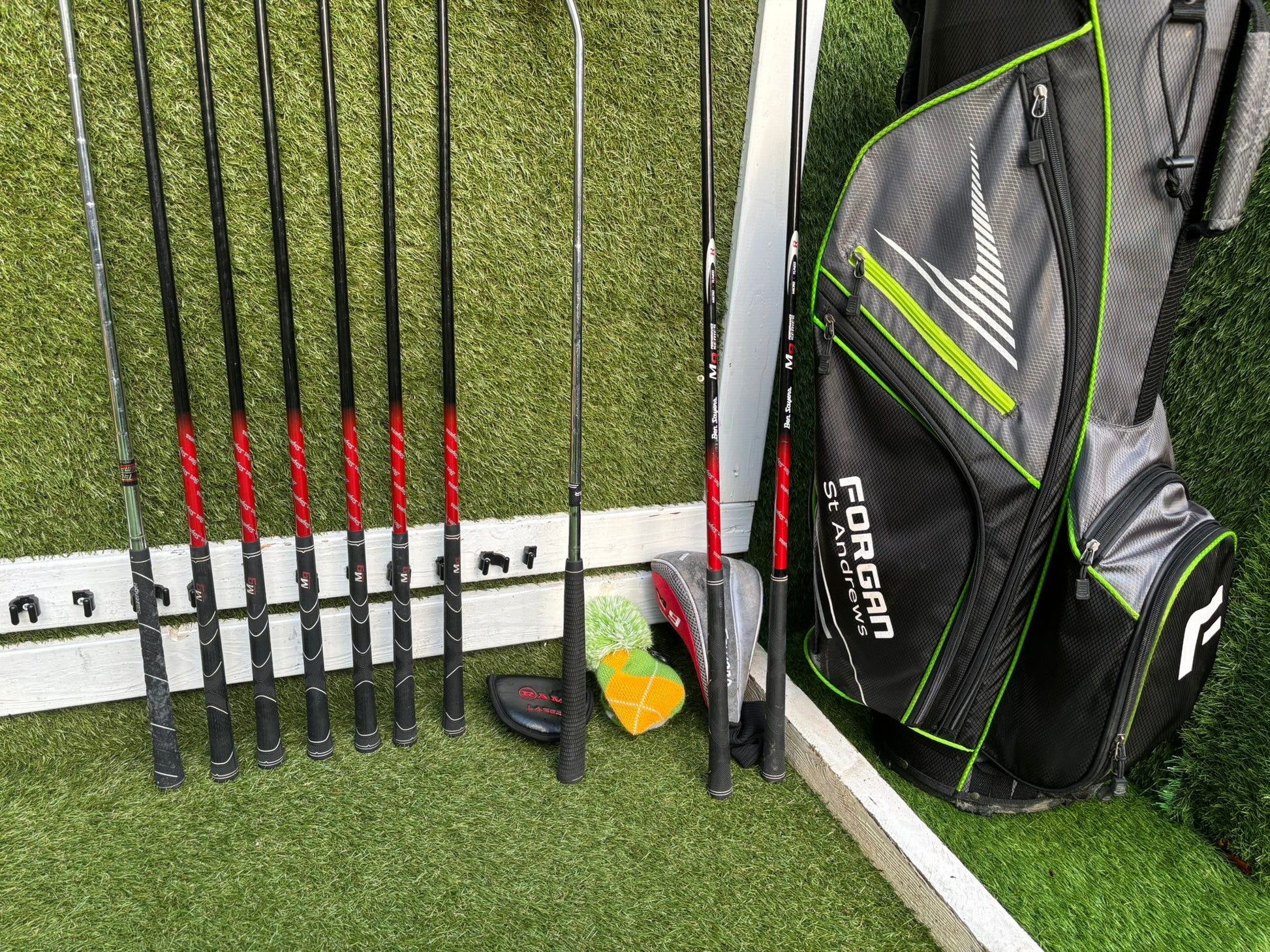 A complete, ready-to-play golf setup ideal for beginners, improvers or casual players. This set features graphite shafts throughout, making it lighter and easier to swing, paired with a quality Forgan St Andrews bag and a matching colour pull trolley for a clean, coordinated setup.