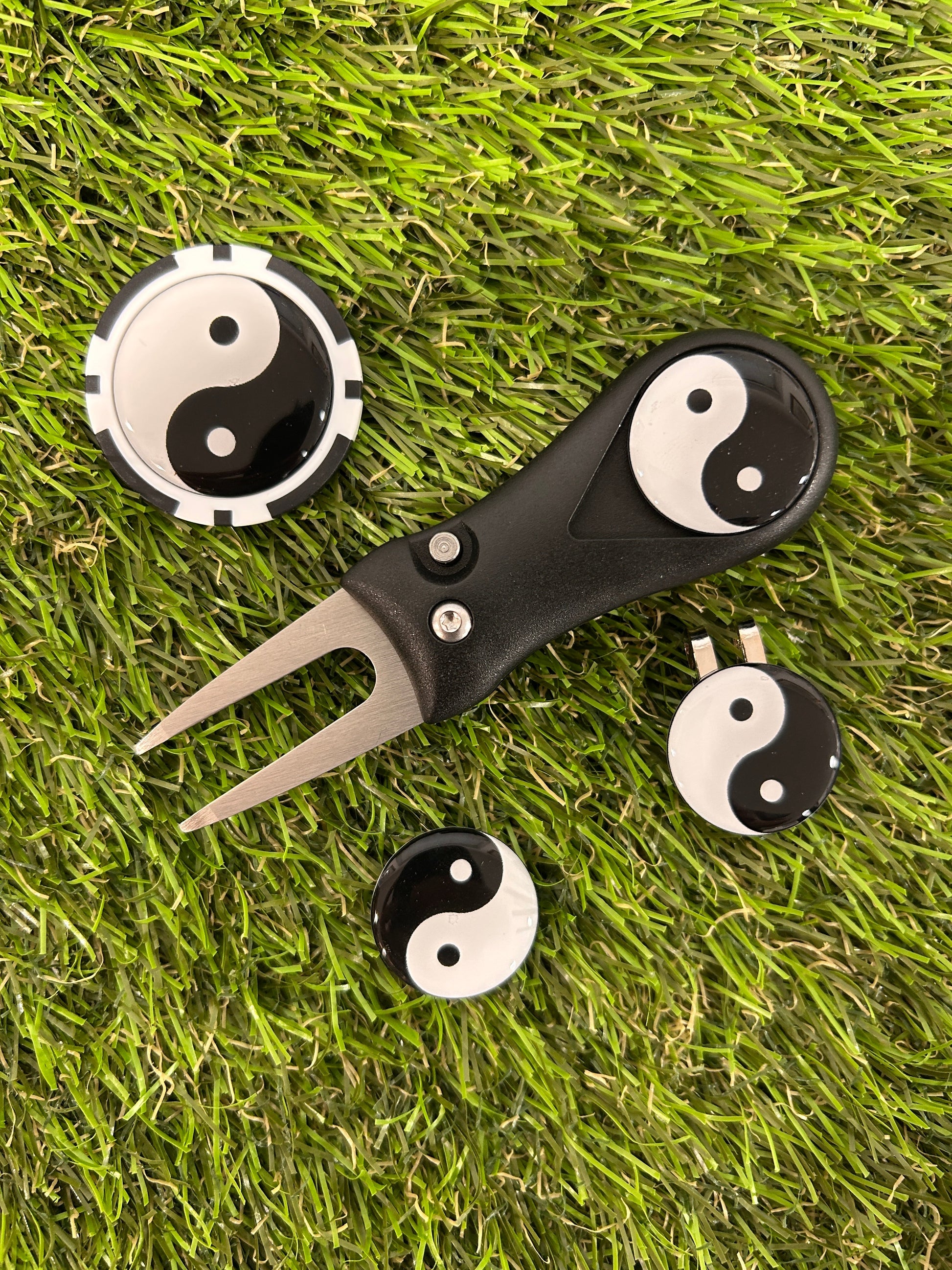 Golf Pitchfork Magnetic Hat Clip including 3 Ying Yang 25mm Markers and poker chip