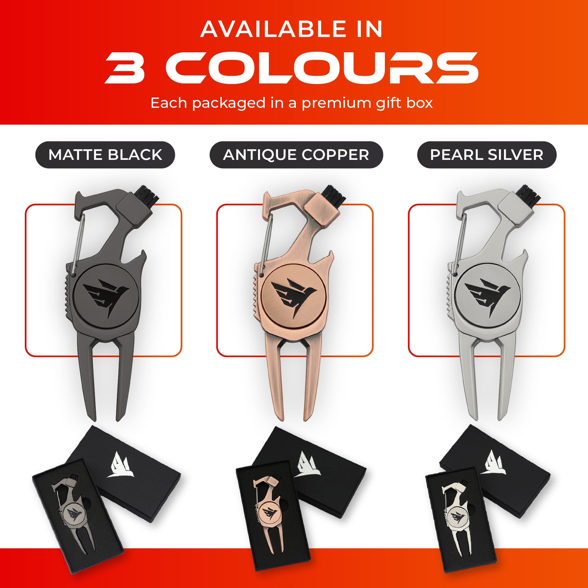 SWIFTEE Golf Divot Pitch Mark Repair Tool 7-in-1 Pearl Silver - Club Holder, Brush, Clip Buckle, Groove Cleaner, Bottle Opener, Ball Marker, Divot Tool - Gift Box Included