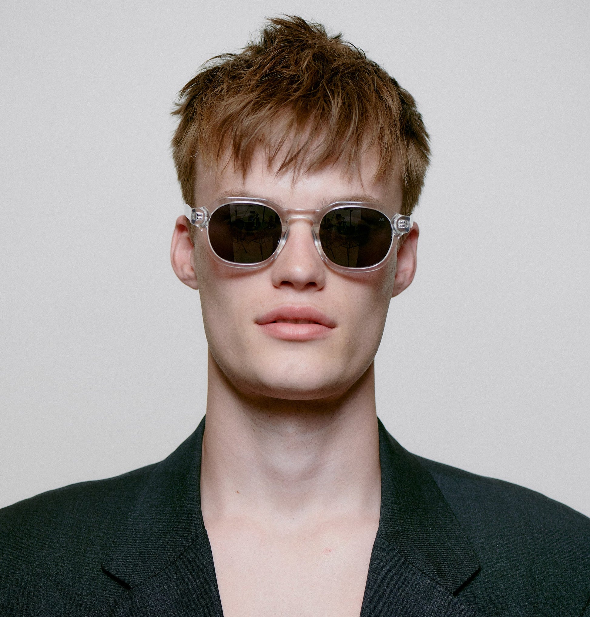 ZAN Sunglasses in Crystal by AKJAERBEDE is a perpendicular interpretation of the classic round design. ZAN's frame creates a perfect contrast between the hard and the soft, and it is an ideal unisex frame as it suits most face shapes.