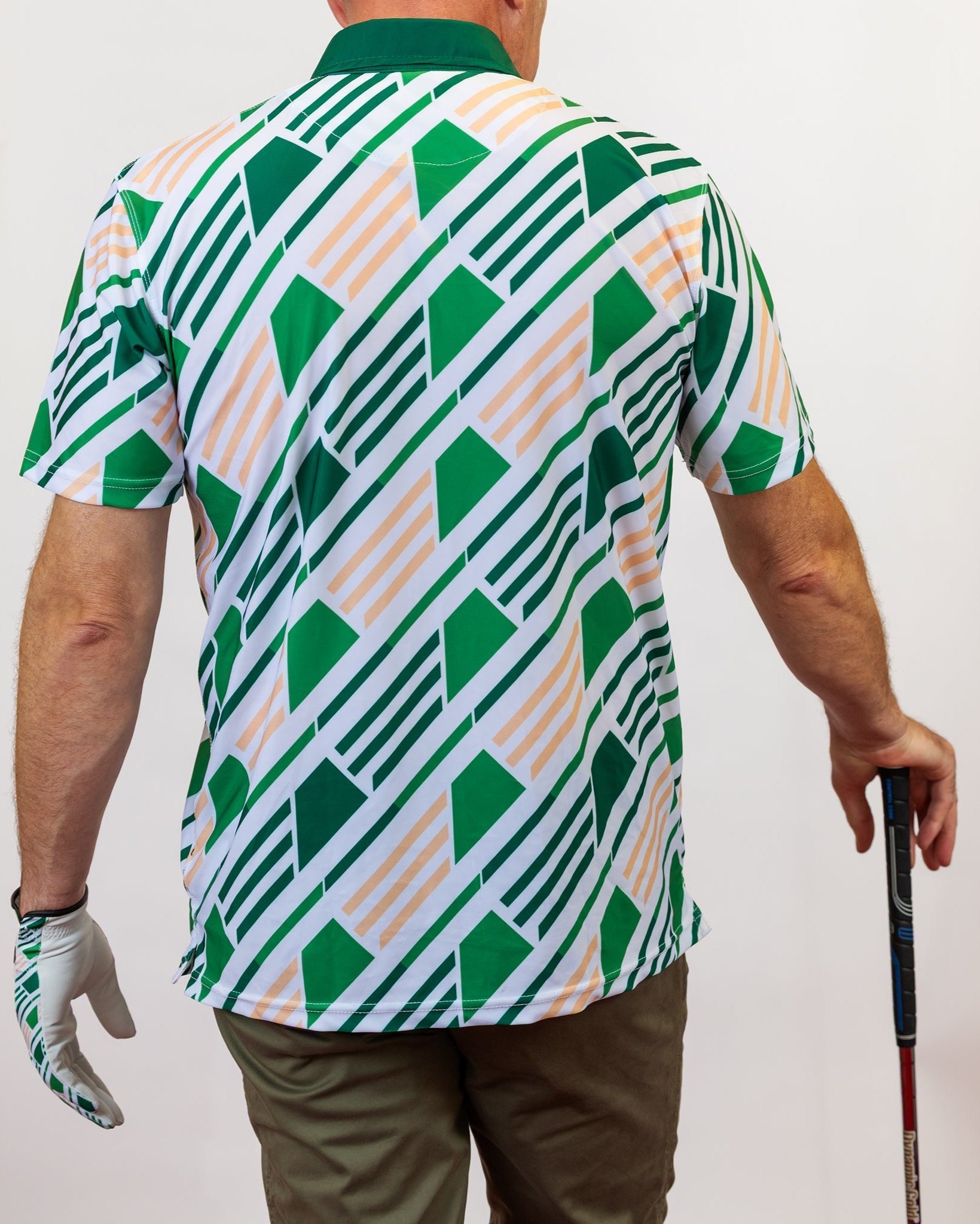Add bold style and high-performance comfort to your game with the Green Geo Performance Golf Polo — a modern essential for golfers who value both function and standout design. Featuring a striking green and white geometric pattern and a solid green collar for contrast, this performance golf polo brings energy and confidence to every round.