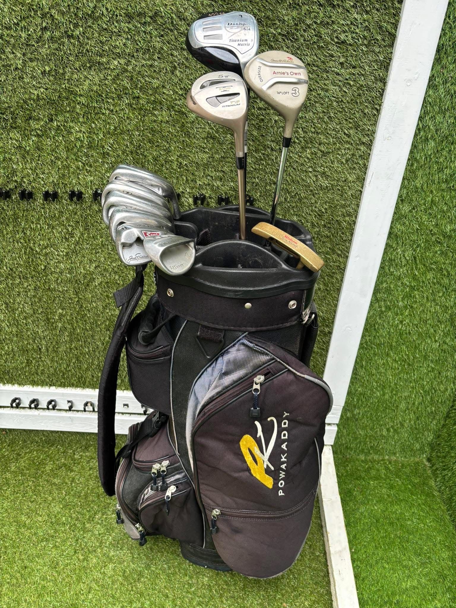 A complete 10-club setup with a Powakaddy cart bag, combining Jack Nicklaus hybrid irons, a Golden Bear wedge, clean Dunlop/Arnold Palmer woods and a classic Wilson putter. A full ready-to-play bundle in very good overall condition.