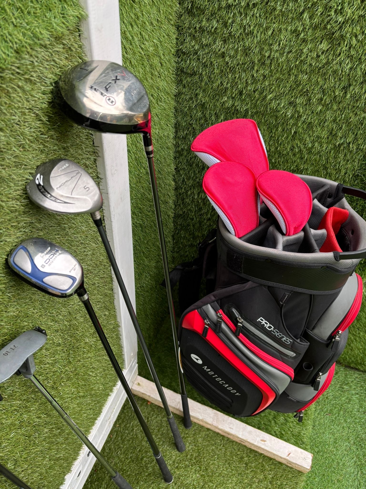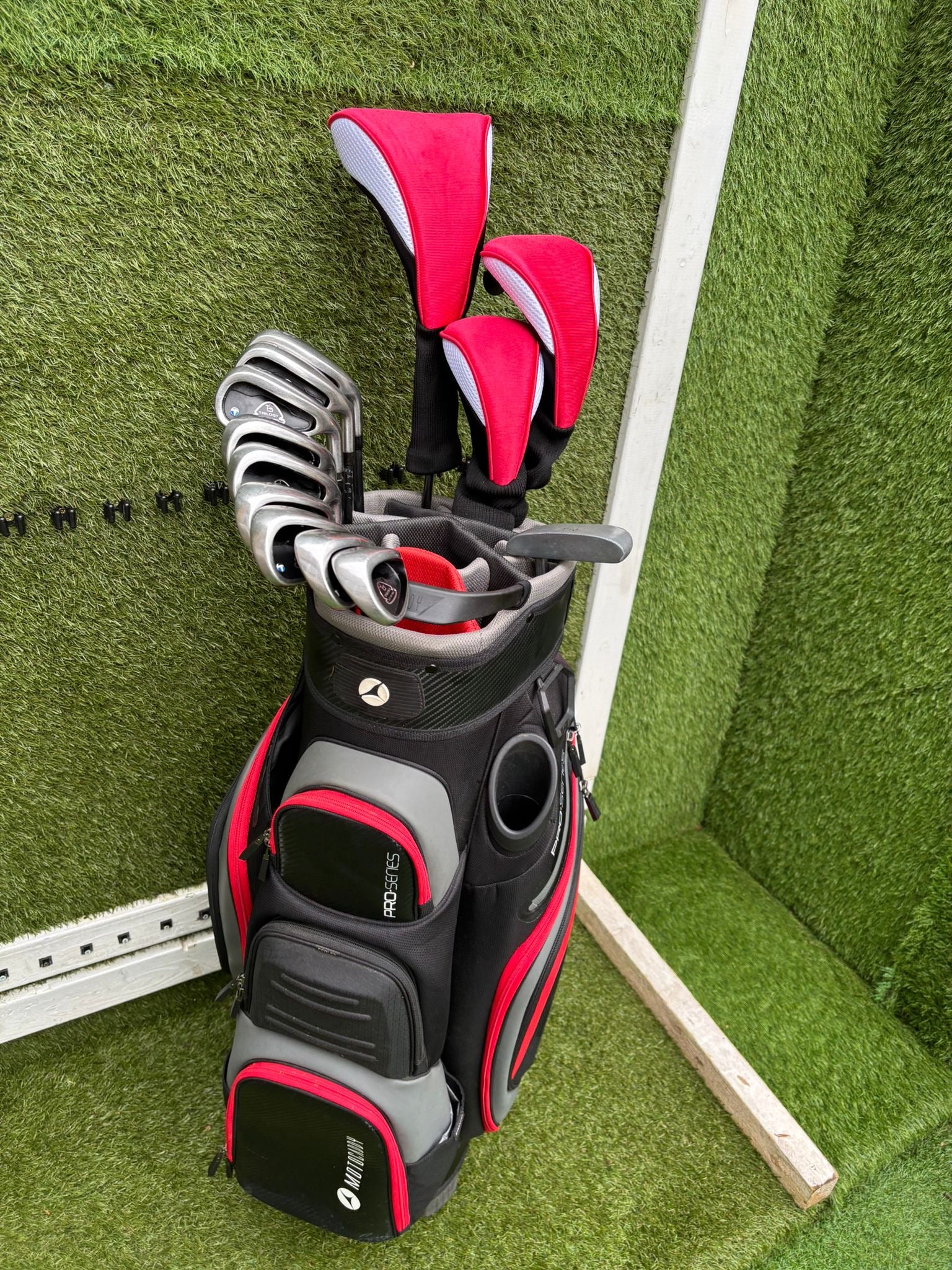 Complete 13-club setup featuring lightweight graphite irons, forgiving woods and a quality Motocaddy cart bag — ideal for beginners or improving players wanting a full ready-to-play package.