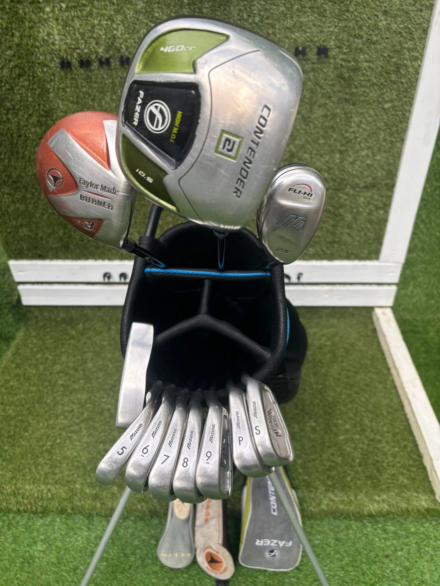 Complete, high-quality setup featuring forged Mizuno irons, classic TaylorMade and Fazer woods, and a collectible T.P. Mills blade putter. A clean, great-feeling full set ideal for improving or returning golfers.