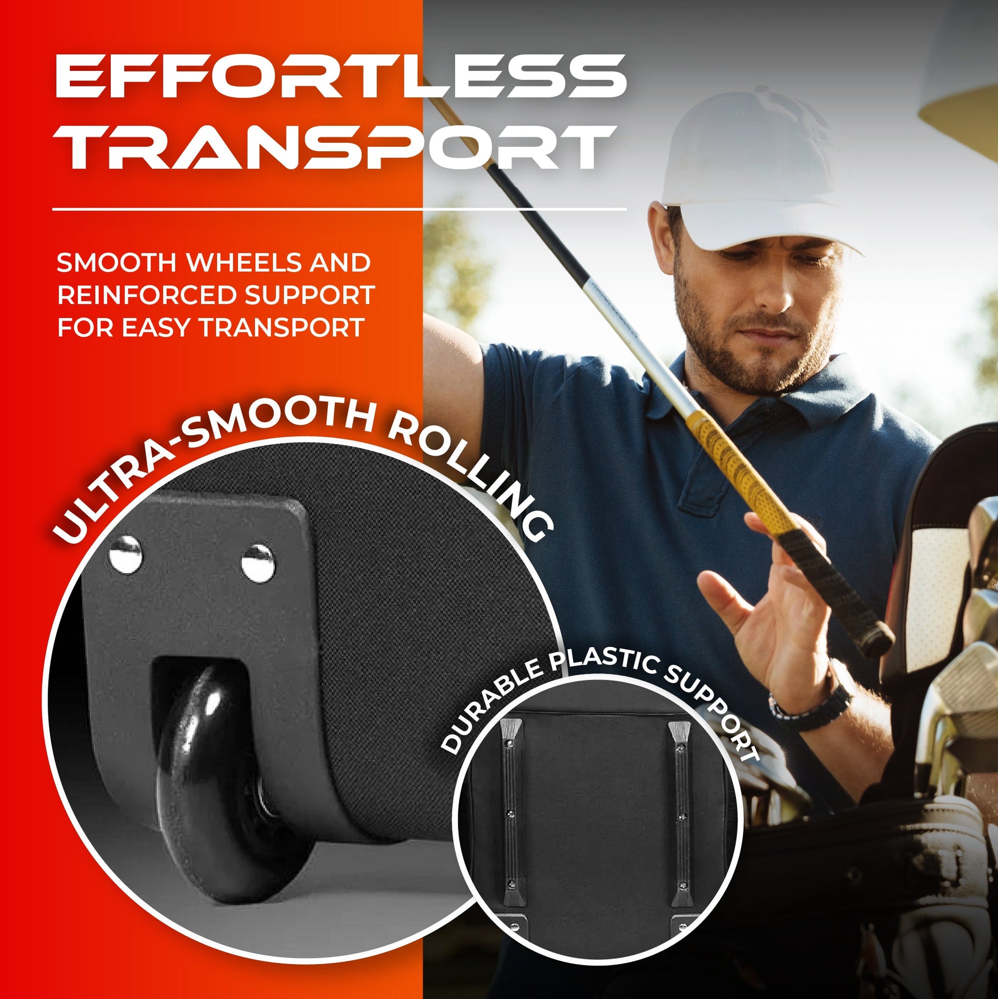 🏌EASY TO TRANSPORT: Smooth wheels with reinforced support. Convenient padded handles and a sturdy design make it effortless to carry. Adjustable straps for secure storage.